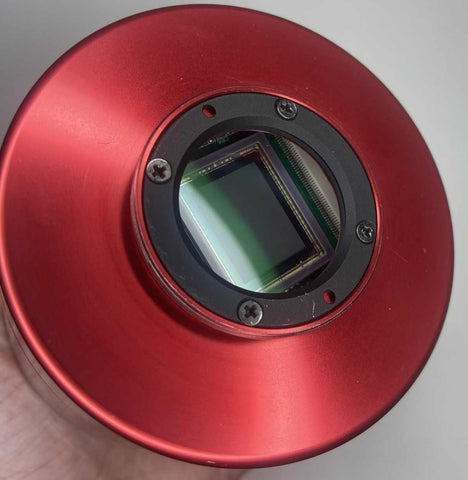 The ASI1600MM-COOL has a robust and attractive CNC machined red-anodized aluminum body that stands up to heavy field use. A clear IR-cut glass window protects the sensor and helps keep images sharp. The camera body includes a standard 2" M42x0.75 internal thread interface on top for adapters, and a 1/4-20 thread in the bottom to make it easy to attach the device to a camera tripod or mount. The M42 adapter can be removed to reduce back focus to just 6.5mm.