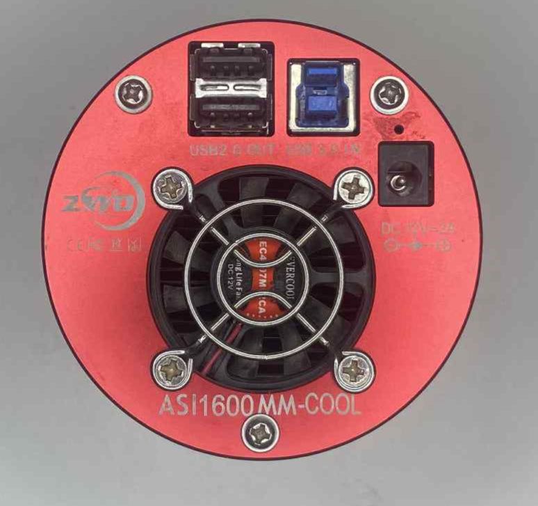 On the camera body, next to the USB3.0 and guide ports, a 2.1mm center-positive connector provides an input for the cooler power supply (not included). From the supply, the camera requires 12VDC @ 2A maximum. A Cooler Power LED shows when the cooler has sufficient power. There's also a large built-in heat sink which accounts for nearly 2/3 of the camera's size. At the top of the camera, an advanced and efficient MagLev fan removes heat from the TEC and control electronics while keeping acoustic noise low.