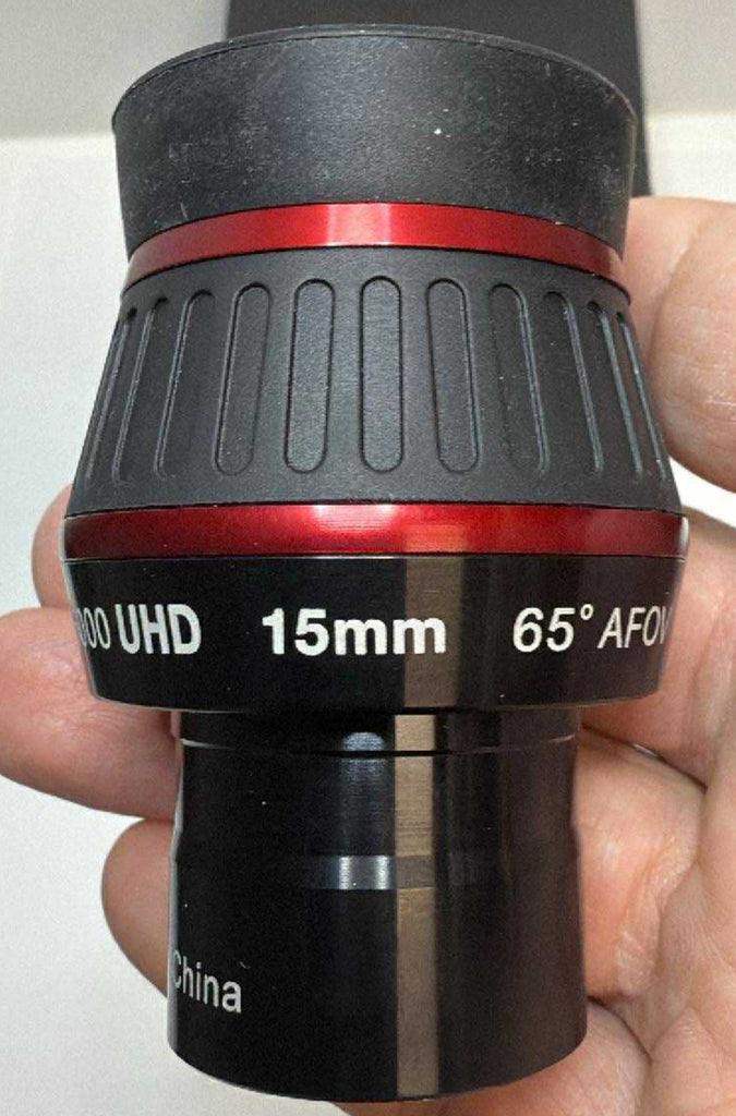 Condition:  This is a Meade 15mm UHD eyepiece with a 65-degree AFOV.  It is in excellent condition, with clean optics and unmarked body.  Comes with both dust caps in its original box.