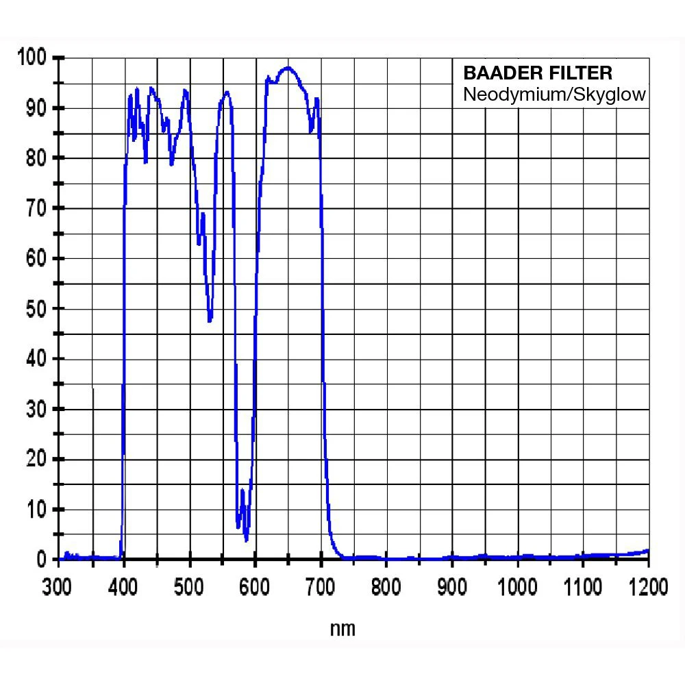 Drastic contrast enhancement for all telescopes, without loss of image brightness! This filter is initially based on a development by Carl Zeiss. The effect of the element neodymium as filter material is very impressive. If used as co-mixture to optical glass, it improves the contrast and enhances the red portions of the image (especially for Mars and Jupiter). At night it blocks that part of the spectrum, which suffers most from street lighting – and it blocks the light pollution, also known as „skyglow“. And lastly, the applied UV/IR blocking coating (Luminance-coating - check the spectral trace) cuts all unwanted UV below 400 nm and NIR above 700 nm - this makes it the „sharpest contrast enhancing filter“ for imaging.