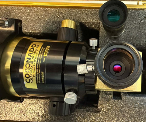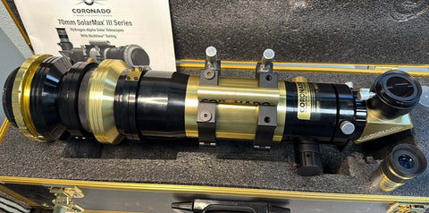 The new Coronado 70mm SolarMax III series telescope with enhanced rack & pinion focuser and large external etalon(s) are now the perfect way to view the Sun! The SM3 70mm comes with an included 18mm CEMAX eyepiece, Sol Ranger™ Solar Finder, Vixen-style dovetail mounting rail, and an all-new black and gold Aluminum Hard Carry Case (Dimensions: 26.5" x 8.66" x 8.66").