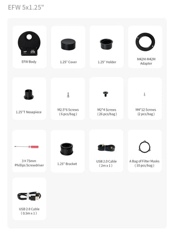 The ZWO Electronic Filter Wheel (EFW) is available in four models, supporting the following filter sizes: