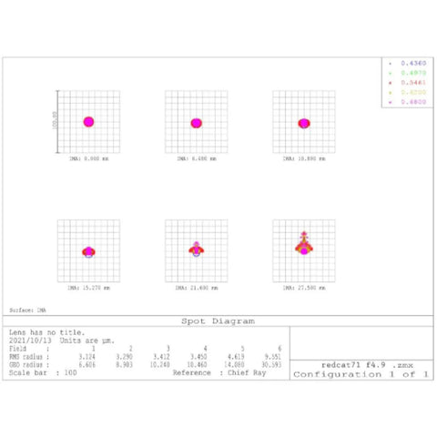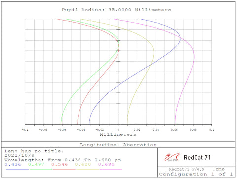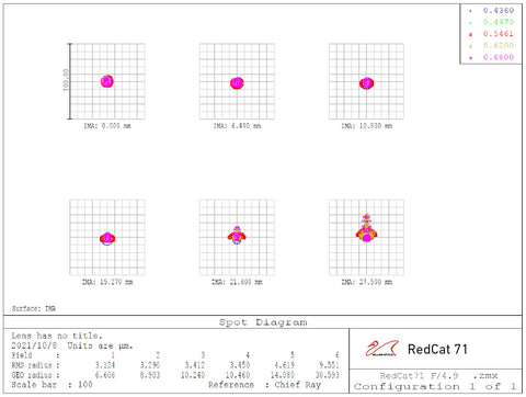 The William Optics WIFD 71 mm APO Astrograph is a premier tool for astrophotographers. The RedCat WIFD 71 provides color-free apochromatic performance. With 4 elements in 3 groups (2-1-1- configuration), the 71 mm RedCat Petzval refractor is designed with a doublet made of FPL-53 glass up front, a single central element, and a single rear lens to provide a flat image plane without any need for an additional flattener.
