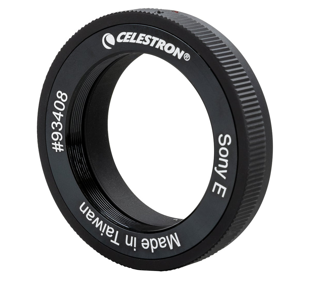 To use this T-Ring, place the E-Mount T-Ring on your Sony mirrorless camera. Just like changing a lens, line up the T-Ring to your camera’s lens mount. Push it in and turn until you hear a click. The T-Ring has a sturdy bayonet flange that locks for a secure fit. Once you attach the T-Ring to your camera, you’re ready to connect your telescope. The telescope side of the T-Ring has threads that accept a variety of camera adapters, including the Celestron T-Adapter. The adapter you choose depends on the type of photography you wish to do.