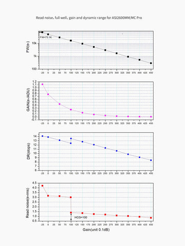 The ASI2600MM/MC Pro achieves a dynamic range of up to 14 stops. When the gain setting reaches 100, the HCG (High Conversion Gain) mode is automatically enabled, which substantially reduces readout noise while preserving dynamic range. For optimal deep-sky imaging performance, a gain setting of 0 or 100 is recommended.