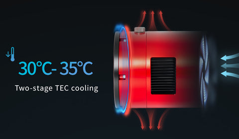 The two-stage TEC cooling system lowers the CMOS sensor temperature by 30°C–35°C below ambient, effectively reducing dark current generation.