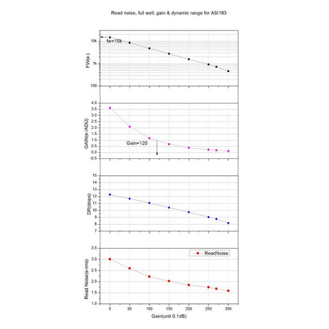 The ZWO ASI183MC-Pro color camera uses a 20.1 megapixel 5496x3672 Sony IMX183 CMOS sensor. Thanks to an innovative photodiode structure and on-chip lenses, the monochrome version of this back-illuminated sensor provides a peak quantum efficiency as high as 84%. Even at the hydrogen-alpha wavelength of 656nm, the QE is over 60%. The full well capacity of the 2.4 micron pixels is 15,000e, while read noise is a low 1.6e at 30dB gain. The low noise and high efficiency of this sensor allow you to capture more light with less noise for a given exposure time. The ASI183MC-Pro also includes advanced firmware to reduce amp glow in the camera.