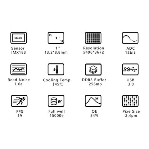 - Sensor: 1″ CMOS IMX183CLK-J/CQJ-J