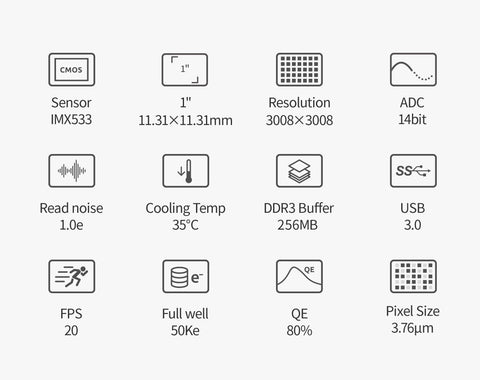 The ASI533MC Pro adopts a Sony back-illuminated IMX533 sensor, which is a 1" square-frame sensor suitable for deep sky photography needs. It can be regarded as an upgrade of the ASI183 series. Not only does it retain the high-quality features of the ASI183, such as high QE and high frame rate, it also features no amp glow, readout noise as low as 1.0e, pixel size of 3.76 μm and two-stage TEC cooling.