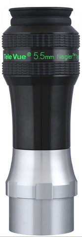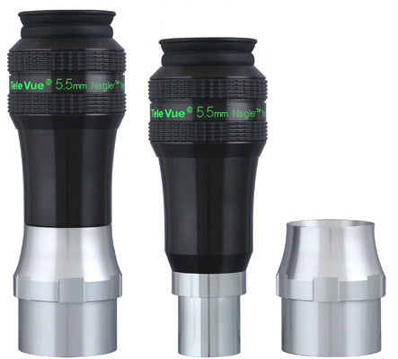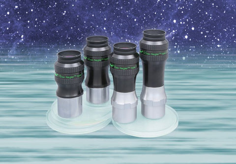Design Details: If you have been waiting for a Nagler series for eyeglass wearers, the Type 7 is it. Combining the expansive 82° apparent field of view with 19 mm of eyeglass friendly eye relief, and large eyelens, the Nagler Type 7s give a new dimension to the "spacewalk" viewing effect. An easily adjustable, locking eye-guard is included for those who don't wear eyeglasses. It helps to correctly position your eye to the exit pupil so you don't get too close to the eyelens, as well as blocks contrast-robbing stray light from interfering with the view. Speaking of which, of course we've applied all the optical coating and baffling features Tele Vue eyepieces are known to maximize contrast and complement the fully corrected field; revealing beautifully natural star colors with pinpoint sharpness. The optical layout affords unrivalled parfocality throughout the four focal lengths and even between 1¼" and 2" modes when used with the Tele Vue Hi-Hat 1¼" and 2" adapter (ASF-8125). The Type 7 series is also parfocal with all other 1¼" Tele Vue eyepieces (except 40 mm Plössl) when those eyepieces are used in the Tele Vue Hi-Hat 1¼" and 2" adapter (ASF-8125). Available in focal lengths of 5.5, 9, 14, and 19-mm, the Type 7s complement the 22-mm Type 4 and 31 mm Type 5 as eyeglass friendly Naglers.