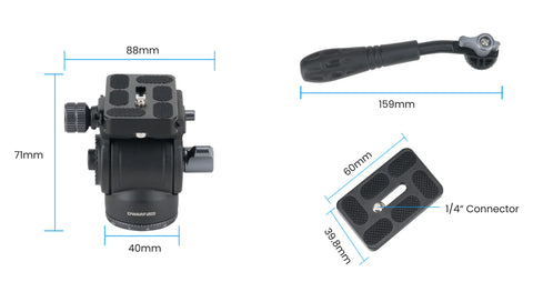The tripod is equipped with a hydraulic head, offering 360° panning and -80°/+90° tilt for a variety of shooting angles and smooth movements. Additionally, you can hang a weight on the hook to increase the tripod's stability.
