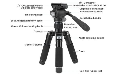The tripod legs are made of aluminum alloy, and the 5-section legs with twist locks allow you to adjust the working height from 25cm to 53cm in seconds. Its 25cm folded size and 790g weight make it easy to carry anywhere for outdoor photography.