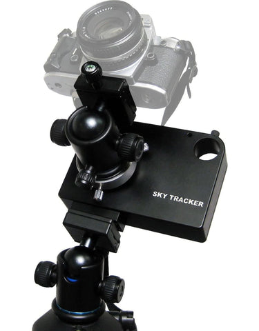 This all-metal camera mount includes these new features: increased payload of 7.7 lbs. and an adjustable AZ base. This portable mount makes it easy to take long exposures of the night sky without streaking or star trailing. The SkyTracker is simple to set up. Just attach the unit to a camera tripod. Then slide and lock your digital camera into the saddle. Align SkyTracker to Polaris, the North Star, using the included dark field illuminated polar scope. Then turn on the motor and it keeps your camera tracking at the same speed the earth rotates! The unique DC servo motor keeps your camera in motion to avoid star trails and allows you to take long exposures for beautiful images of the night sky. SkyTracker runs on 4 AA batteries for portability at any location.